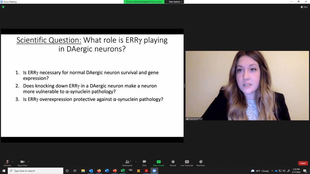 Stephanie Fox joined the King lab just after earning her Master’s degree in Biotechnology. As a technician she was incredible, supporting the lab while driving forward to produce data and discover new knowledge. As a graduate student she’s continued to make us proud, weakenesses strengthened, massive data, hard project, incredibly new knowledge into mechanisms of Parkinson’s disease AND a K00/F00 to power her forward into her first postdoctoral fellowship. GO STEPHANIE. Proud doesn’t even begin to explain the all the feelings!