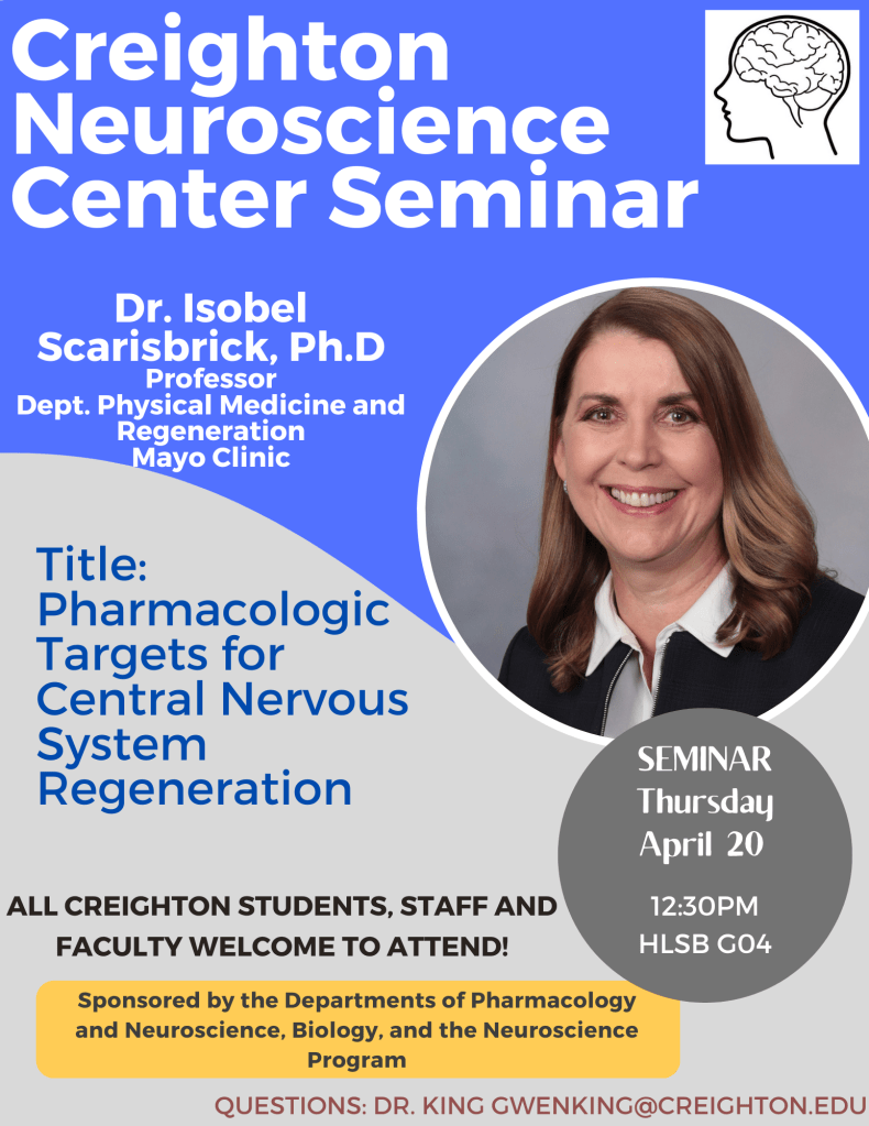 Dr. Scarisbrick is visiting Creighton from the Mayo Clinic 4/20/23 with a talk on targeting brain regeneration at 12:30 and then speaking at Graduate School Signing Day at 4pm.